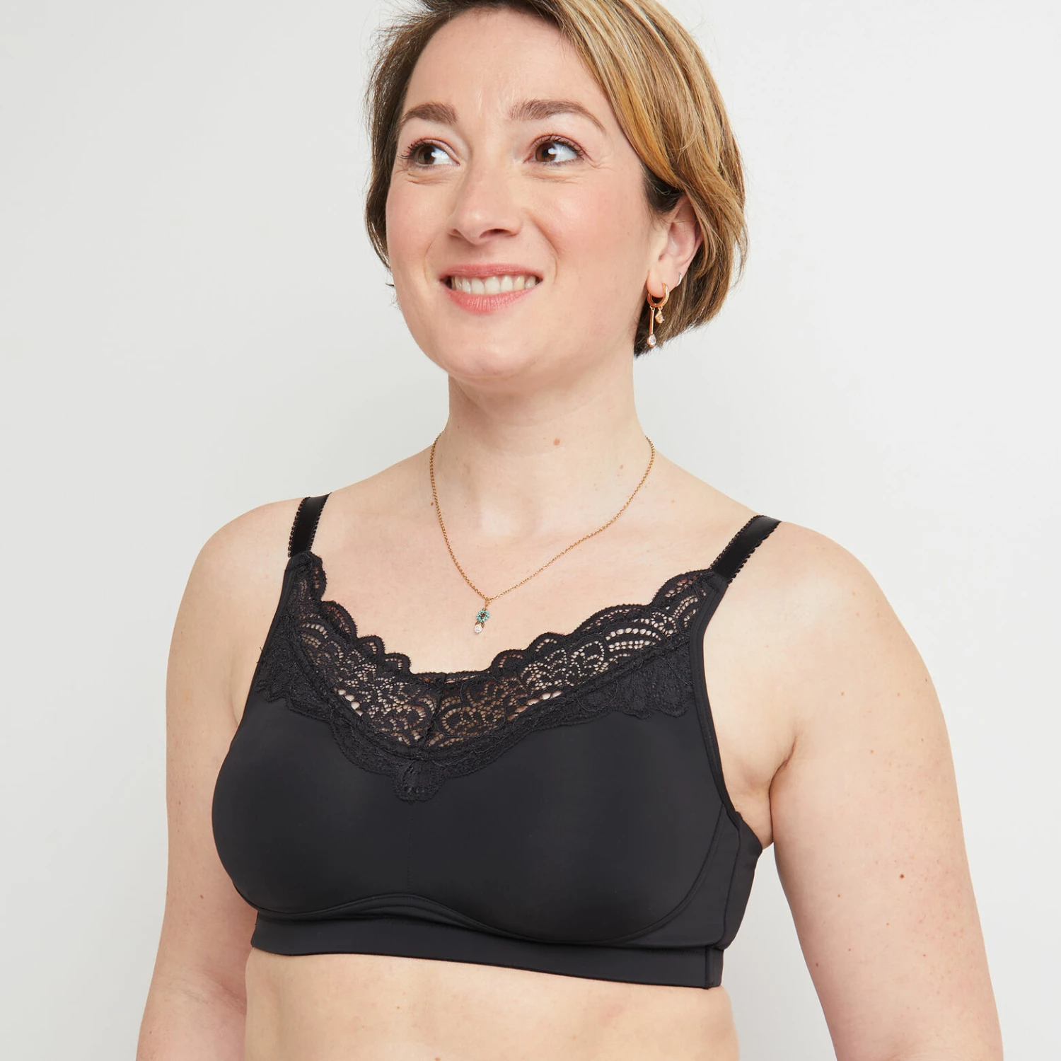 « Les Ă©quipes RougeGorge soutiennent la lutte contre le cancer du sein. Cet engagement nous a permis de co-crĂ©er avec nos clientes concernĂ©es, des soutiens-gorge post-opĂ©ratoires spĂ©cialement Ă©tudiĂ©s pour les femmes ayant eu une mastectomie totale ou partielle. Doux et couvrants, ils masquent les cicatrices et sont comme une caresse sur la peau. Sans armatures, Ă©lastiquĂ©s sous la basque, ils offrent un confort absolu. A l’intĂ©rieur, la doublure moelleuse en coton est sans pince pour Ă©viter les frottements dĂ©sagrĂ©ables. Elle permet aussi de placer discrètement des prothèses mammaires. » – Modèle DENTELLE emblĂ©matique chez RougeGorge – Forme brassière – Microfibre lisse et ultra confort – DĂ©colletĂ© soulignĂ© de dentelle ajourĂ©e et festonnĂ©e – Large bande Ă©lastiquĂ©e sous les seins – Sans armatures – Bretelles Ă©lastiquĂ©es et ajustables dans le dos, bouclerie ton sur ton – Dos entièrement conçu en microfibre unie, signature RougeGorge en lettres dorĂ©es – Fermeture dos par agrafes.