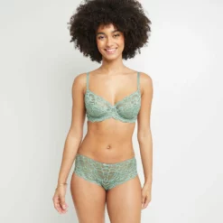 « Tant de lĂ©gèretĂ© et de romantisme en une parure d’inspiration vĂ©gĂ©tale, fraĂ®che et gracieuse. Une sublime dentelle ajourĂ©e conçue en fibres recyclĂ©es (40% minimum), une petite touche vintage et un coloris très printanier… un vrai bonheur. »