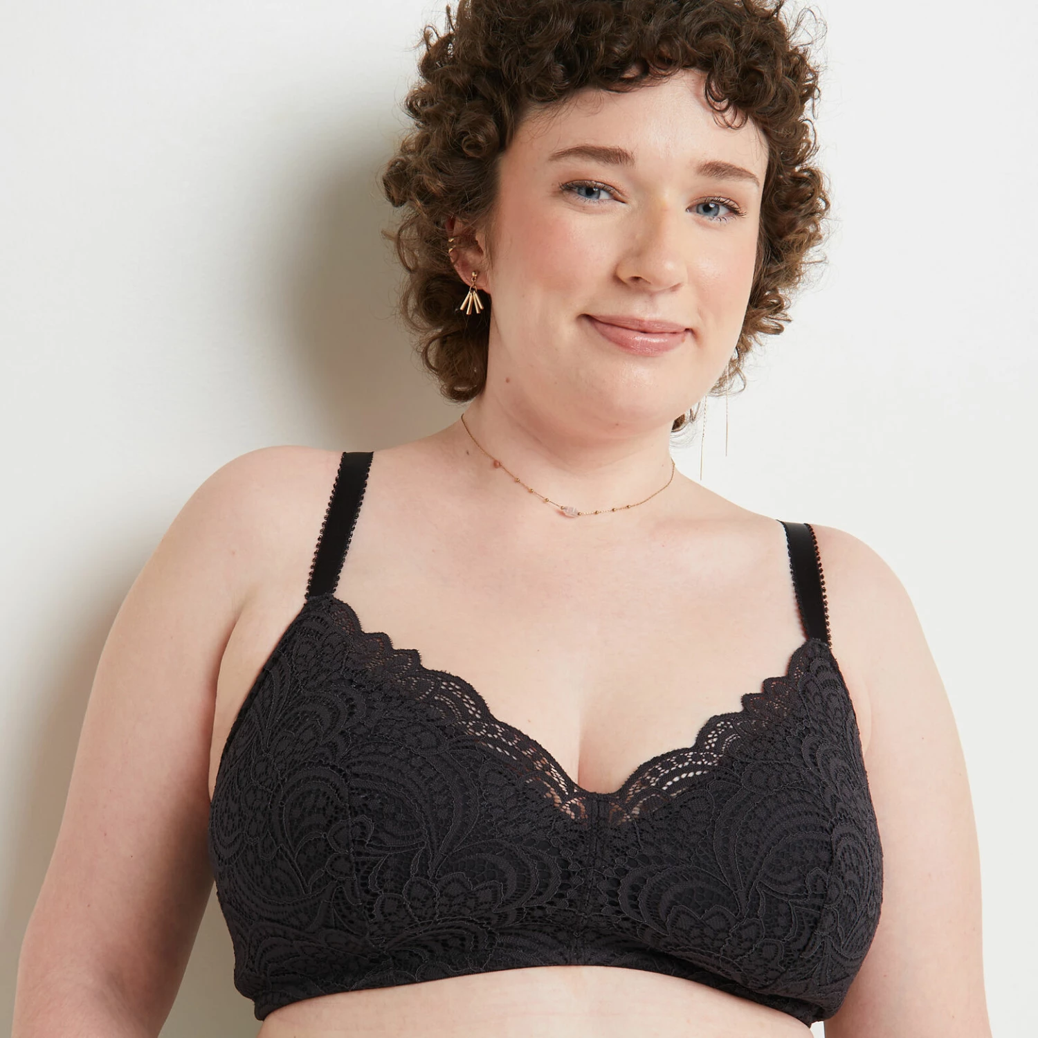 – dĂ©colletĂ© soulignĂ© de dentelle ajourĂ©e et festonnĂ©e